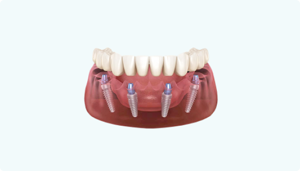 Для восстановления зубного ряда на одной челюсти используем всего четыре имплантата. Два устанавливаем вертикально в передней части челюсти. Еще два — под углом в боковом отделе, в местах с наибольшим объёмом костной ткани — это дает протезу надёжную опору. После установки имплантатов фиксируем несъёмный протез.